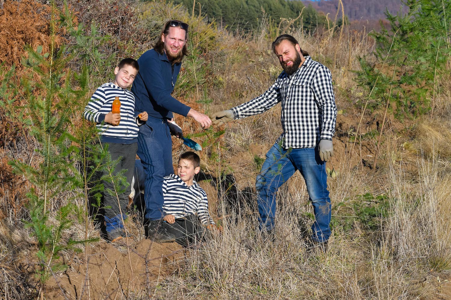 We arrived at the mountain around 7:30 in the morning. The seedling diggers (Mitko Stevcev – Treebanks team, Andon Kochev and Dobrin Kazandziev) immediately started digging out seedlings in order to have front for work prepared for the volunteers that were about to arrive. In the meantime me (Mihail – Treebanks team) and Petar Efnushev we added signs on each of the locations for planting and we moved the drilling equipment on sight. You are probably already sensing that we were the Drillers team :).