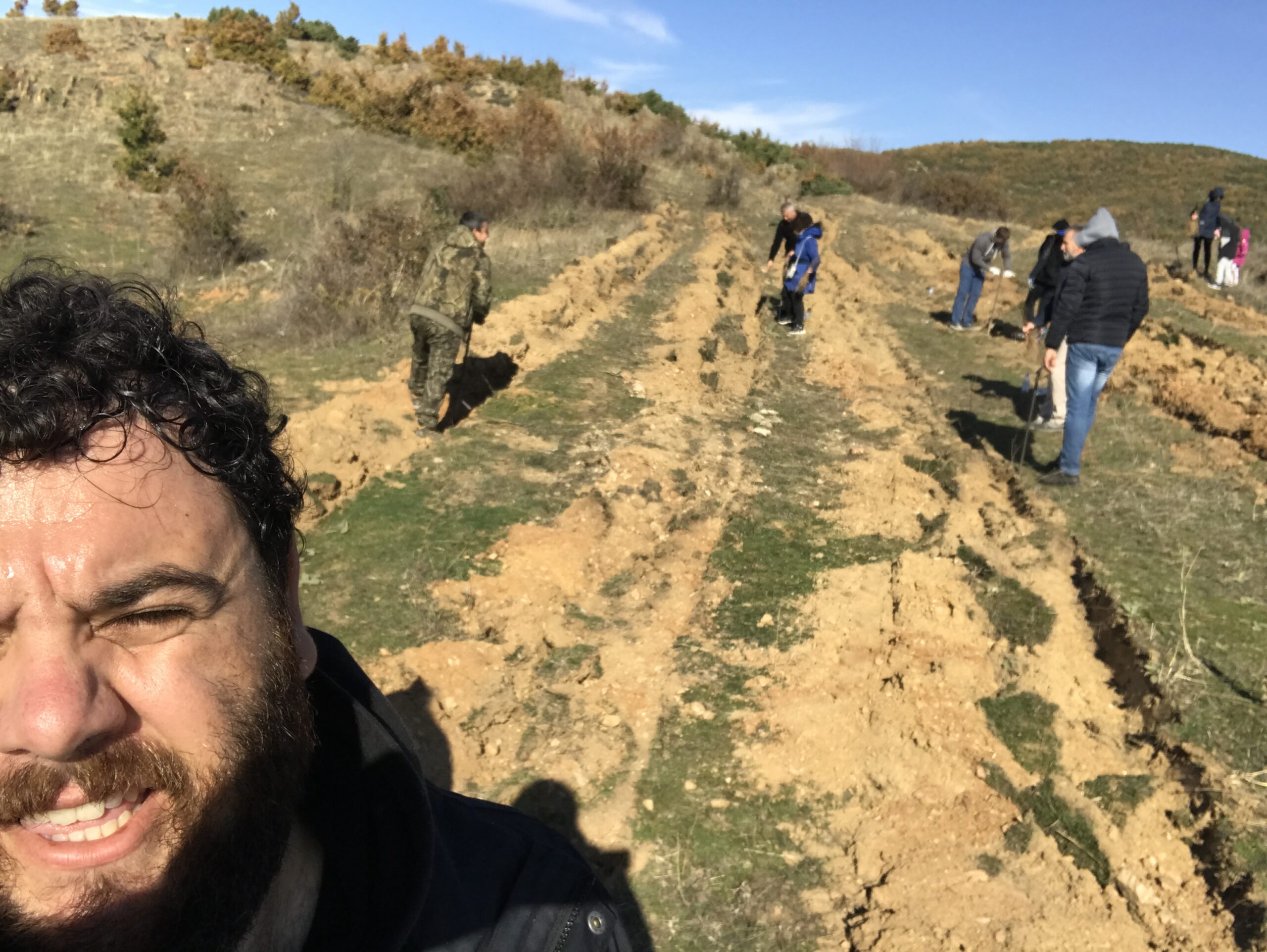 Shortly after we filled completely Neven and Mitko’s team the mayor of Radovish, Aco Ristov joined and we started planting on the second location. Within a glance all teams formed and we ran out of planting tools. We were planting trees in full throttle. Irina Tosheva (a fashion designer) joined us. Last year together with her we run a campaign that Treebanks will plant a tree for each piece of clothes bought from her collection, so Irina came to help us and document the process.